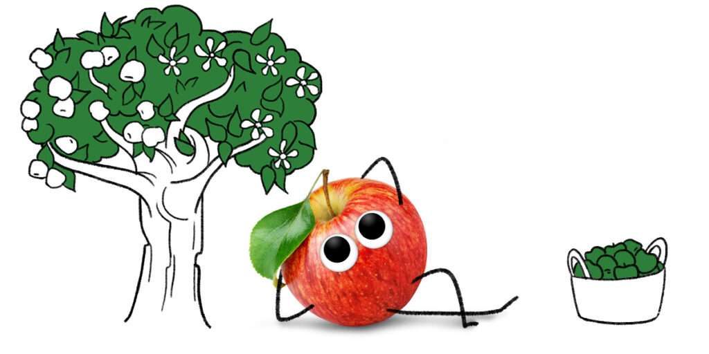 … wie grün sind meine Blätter… Auch meinen apfeligen Körper gibt es in grün. Als roter Alfred Apfel bin ich aber eher bekannt und weniger als gelbes Obst – „Kernobst“ um kern-genau zu sein. Wir wachsen am Obstbaum. Zuerst wächst aus einem Apfelkern eine Minipflanze, die später ein Apfelbaum wird. Seine Blüten werden von Insekten bestäubt und daraus wachsen dann wir Äpfel. Pflanz mit Deinem kleinen Schatz doch selber mal einen Apfelkern ein und schaut, was passiert.
