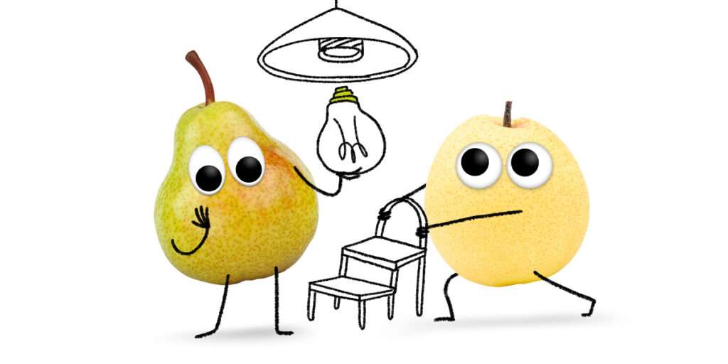 Bettie Birne, das ist ein Name, den Ihr Euch merken solltet. Warum? Wie mein Name verrät – ich bin eine Birne. Eine, die es in sich hat. Doch Achtung: Ich kann nicht leuchten, bin keine GLÜHBirne. Wachse ich in Deinem Garten? Habt Ihr dort einen Bettie-Birnbaum gepflanzt? Ich habe eine grüne Farbe, eine ovale-rundliche Form und schwarze Augen, mit denen ich in die Weltgeschichte schaue. Mein Markenzeichen – das heißt, etwas, was mich einzigartig macht – ist mein Zopf, mitten auf meinem Kopf. Na ja, eigentlich ist es ein Stängel.