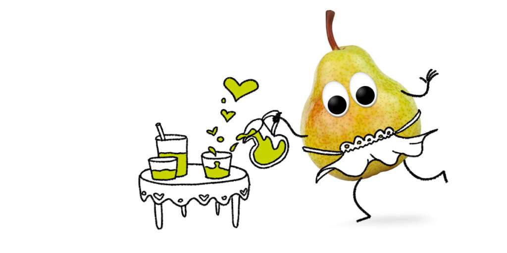 Bettie hat Power und ist voller Saft, weil sie sooo viel BirnenKraft hat. Genial. Echt magisch. Sobald ich reif bin, kannst Du mit mir viel anstellen. Eine Idee: Birnensaft – Saft aus der Birne? Genau. Ausgepresst kannst Du mich trinken. Oder mit anderen süßen Säften zusammenmischen. Hmmm, echt lecker – BirnenApfelOrangen-Cocktail zum Beispiel! Probier’s aus und genieße mich. Nehmt mich doch auch als Snack für Kita & Schule mit.