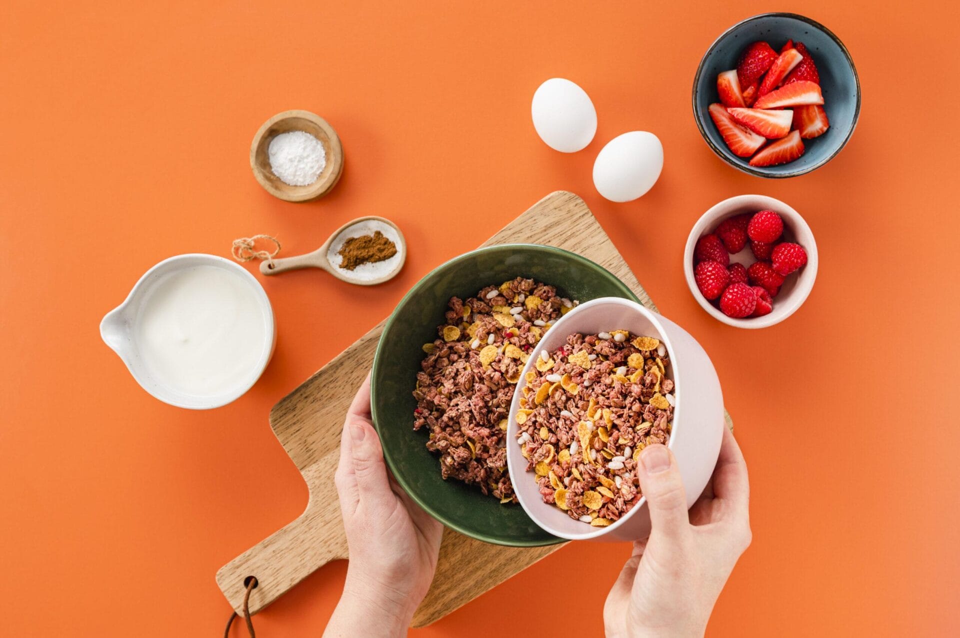 Haferflocken, Eddas Knusper Müsli und die Hälfte der Beeren in einer Schüssel vermischen. Backpulver und Zimt hinzufügen.