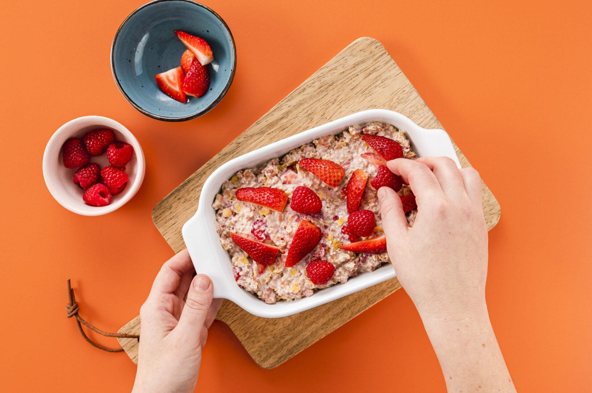 Alles in eine Auflaufform geben und mit den restlichen Beeren dekorieren. Den Kuchen etwa 30 Minuten im Ofen auf 200°C Ober/-Unterhitze / 180°C Umluft backen.