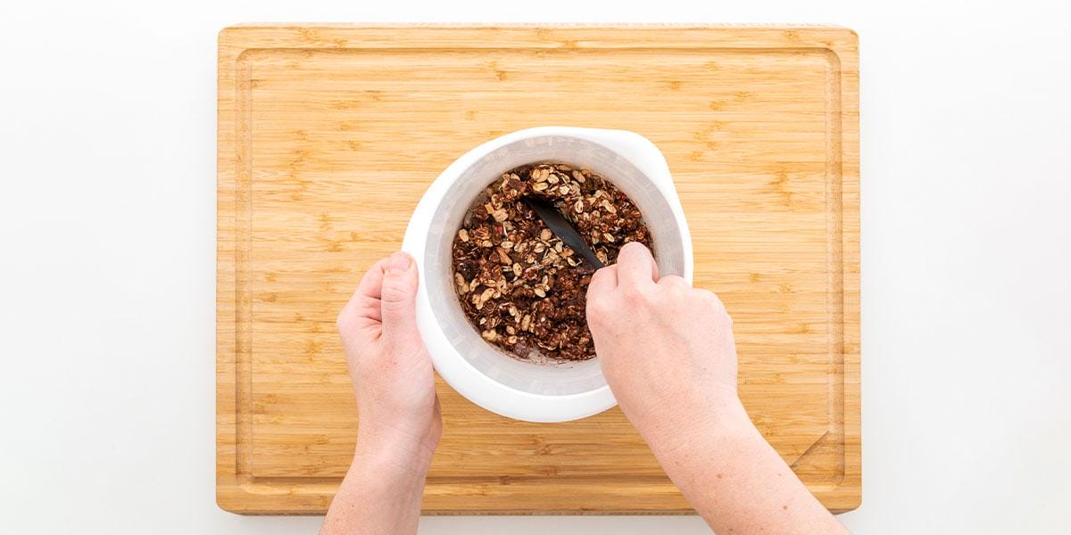 Banane, Kakao und Müsli zusammen in eine Schüssel geben.