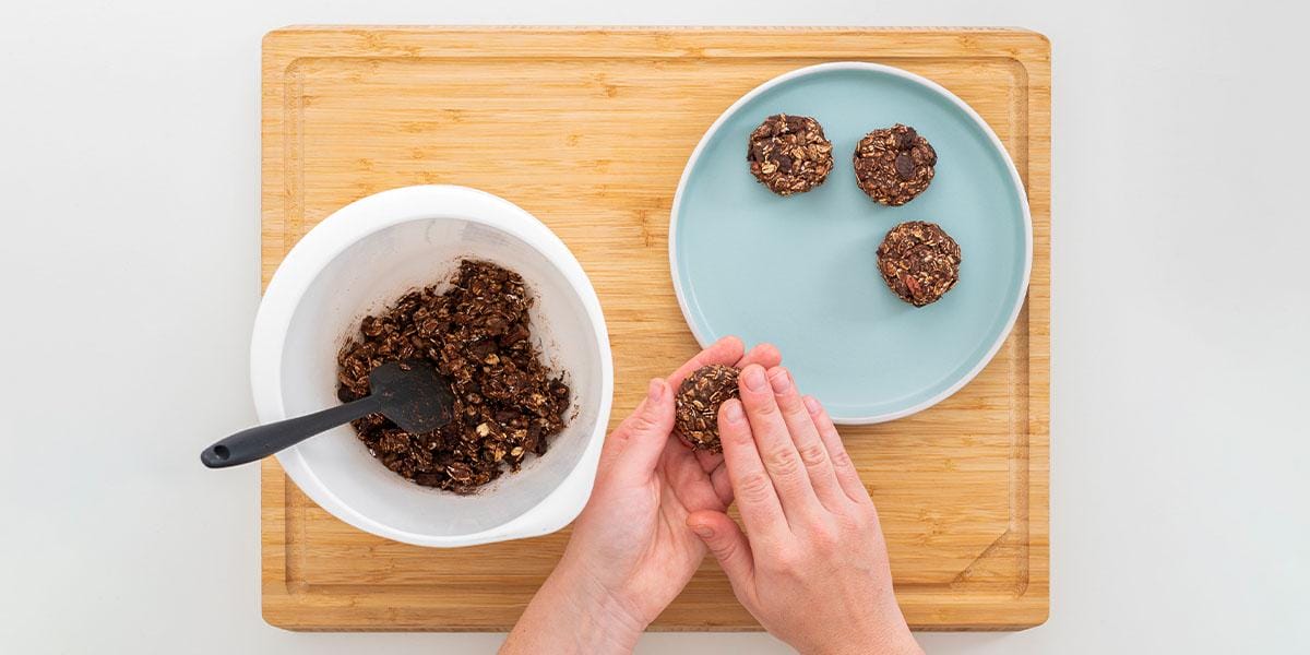 Den Teig 5 Minuten ruhen lassen. Dann den Teig mit nassen Händen portionsweise entnehmen, zu Kugeln formen und anschließend flach drücken, sodass eine Cookie-Form entsteht.