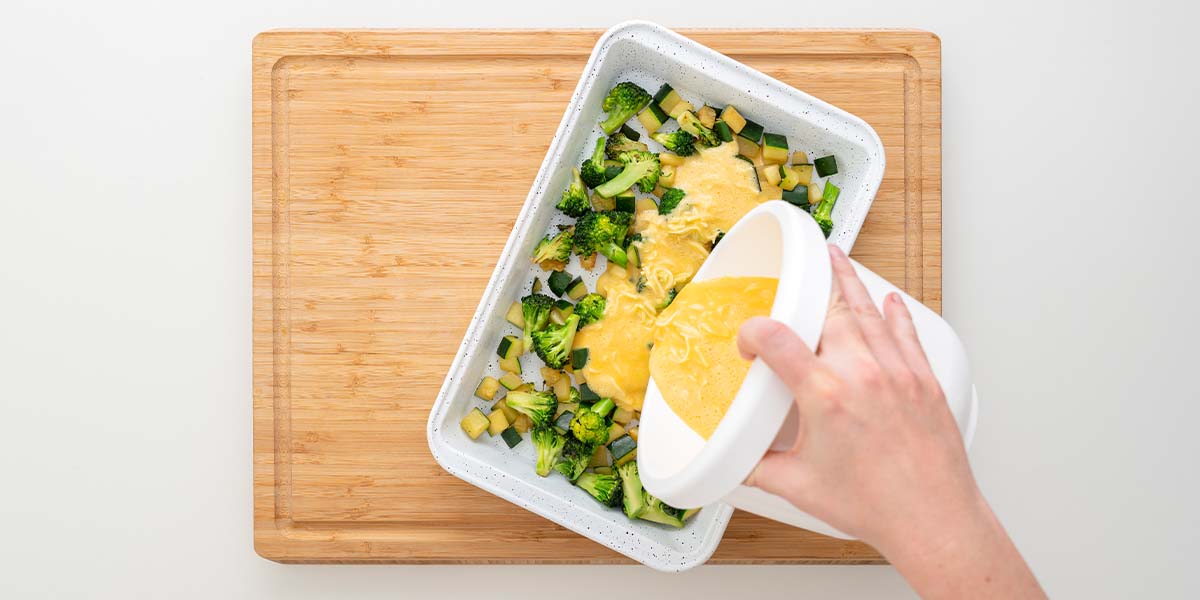 Das Gemüse in eine eingefettete Auflaufform verteilen und die Eiermasse darüber gießen.