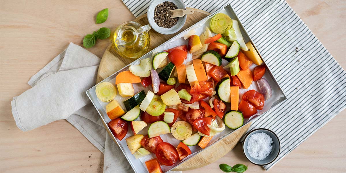 Das Gemüse für 40 Minuten in den Backofen geben.